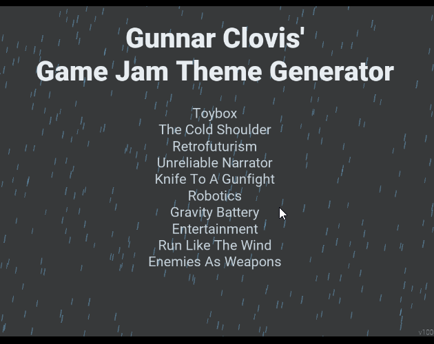 While I want to try to make some truly procedural jam theme generation engine that would slap different nouns and genres together from a list of possible sentence structures, making genuinely knew themes that were never written before, I did not have the time nor energy to attempt such a system. I may come back to this and add such a system, but for now this is a very simple random lookup generator, as all game jam theme generators online seem to be.